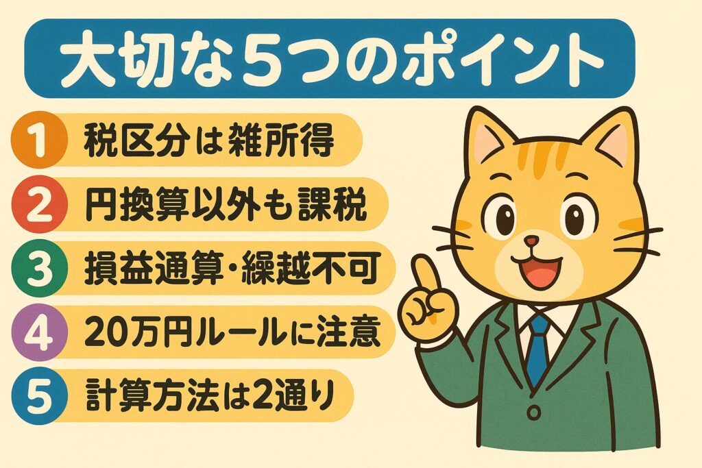 - 「円に換えなければ税金はかからない」と思いがちですが、決済と交換でも課税されるので注意しましょう。